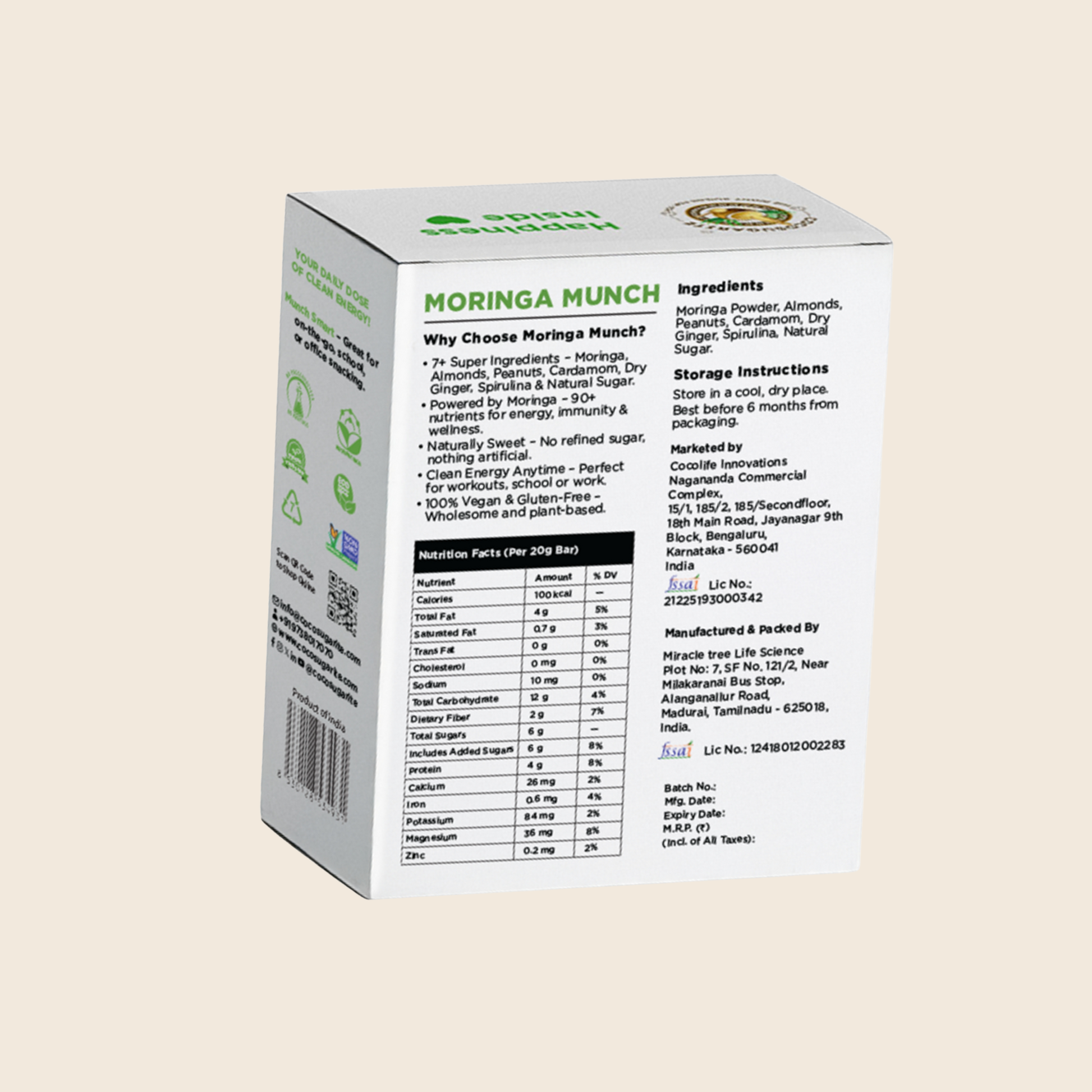 Boost your brainpower and energy naturally with Moringa Munch, a protein-packed bar enriched with moringa leaf powder, Omega 3-6-9, and plant-based nutrition. Moringa Munch is crafted with the power of moringa—known as the “Miracle Tree.” Each bar delivers a daily dose of natural brain food with Omega 3, 6, and 9 for sharper focus, better memory, and lasting energy. Ideal for kids during study hours, professionals at work, or seniors for active aging.